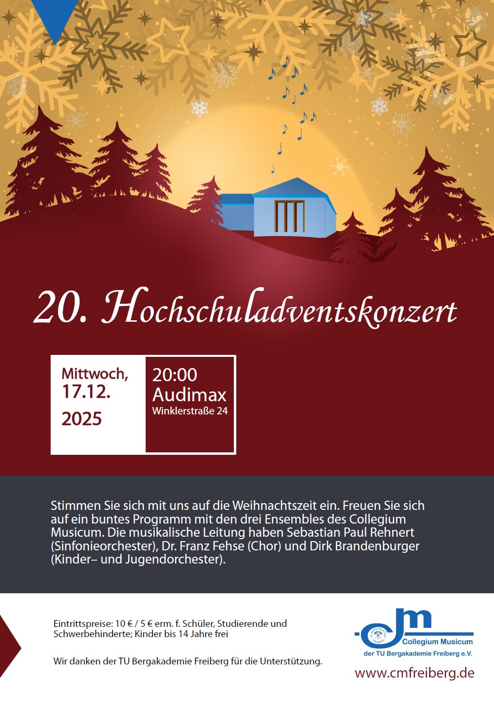 Am Mittwoch, 17. Dezember 2025 findet im Audimax der TU Bergakademie Freiberg, Winklerstraße 24, unser 20. Hochschuladventskonzert statt